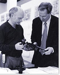 Mark Fuller, President of WET Design and Mark Rosheim studying rapid-prototyped Oarsman components.